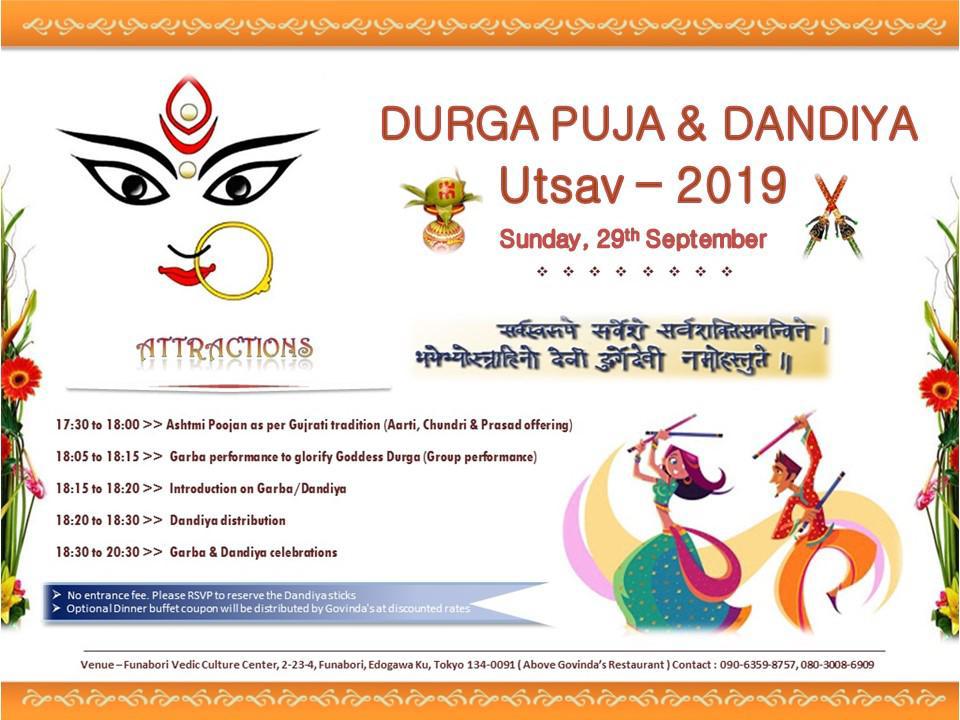 Dear Friends, Jai Maa Ambe! Jai Maa Durga! Following auspicious celebrations of Ganesh Chaturthi, we are now excited to celebrate Durga-Puja. Durga-Puja celebrations will be held on Sep-29 (Sunday), in VCC from 17:30 to 20:30. Please check the attached Chirashi for details. Cultural exchange: This shall also include cultural exchange program with our Japanese friends
