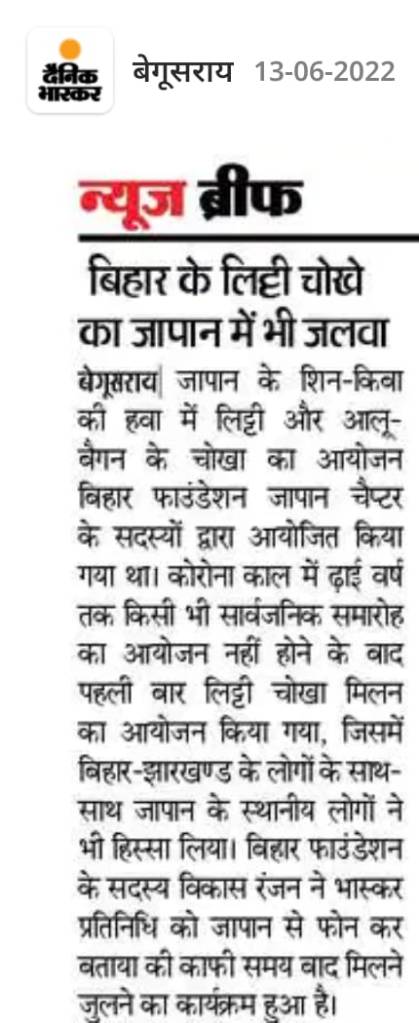 बिहार के आवो-हवा में न केवल बौद्धिक संपदा के गहरे खदान हैं बल्कि ईहा के मांटी और मसालों से उपजे व्यञजनों की खुशबु और चटकारे दूर देशों में भी लिए जाते हैं । बिहार की भरी पूरी संस्कृति में खाने के खजाने का जो योगदान है वो अद्भुत व् अद्वितीय है । वही व्यंजन देश और विदेश में अलग अलग जगहों पर रह रहे बिहारियों की भावनाओं को अपनी जमीन और संस्कृति से जोड़ने के लिए एक सेतु का काम करते हैं । बात जायकेदार व्यंजन की हो और लिट्टी चोखा की चर्चा न हो , ये तो हो ही नहीं सकता…कुछ ऐसी ही सोच लिए 12 जून 2022, रविवार को जमा हुए जापान में रह रहे बिहार फाउंडेशन जापान के प्रवासी सदस्य ।