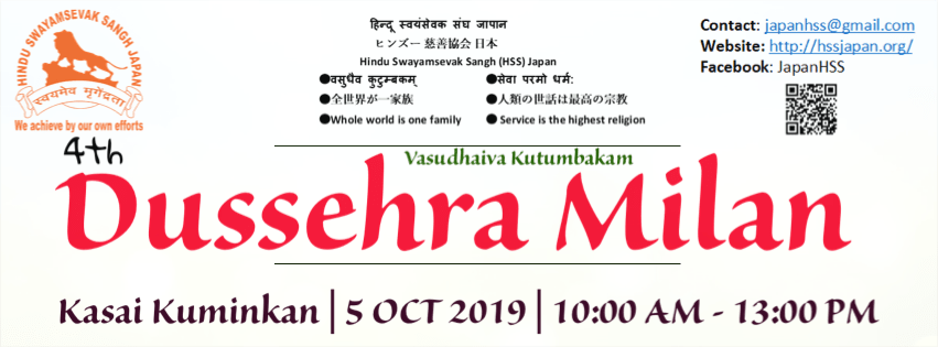 Hindu Swayamsevak Sangh (HSS) Japan is honored and pleased to invite you all to the 4th Dussehra Milan that will take place at the Kasai Kuminkan on 5th October’2019. We greatly believe your presence will help in building a multicultural Indo-Japanese society. On this occasion , we felicitate Indian and Japanese community leaders who have been putting their efforts to promote Indian
